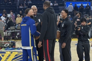 昔日黄金搭档!火勇对决赛前 杜兰特与库里互动相谈甚欢