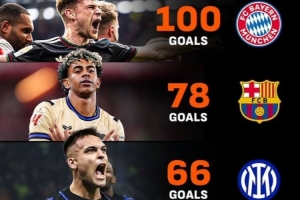五大联赛进球榜:拜仁100球、巴萨78球、国米66球、枪手巴黎各61球